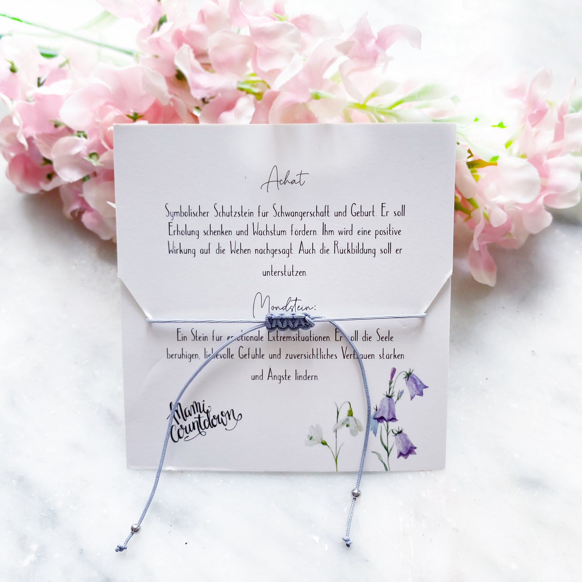 Geschmückt ist das Armband mit Achat und Mondstein. Der Achat ist ein symbolischer Schutzstein für Schwangerschaft und Geburt. Ihm wird eine positive Wirkung auf Wachstum und Wehen nachgesagt. Dazu sieht er natürlich auch noch hübsch aus. Der Mondstein soll außerdem für eine beruhigte Seele stehen. Ganz egal, ob auch du den Steinen diese Eigenschaften zuschreibst, wir wünschen dir viel Spaß beim Tragen!